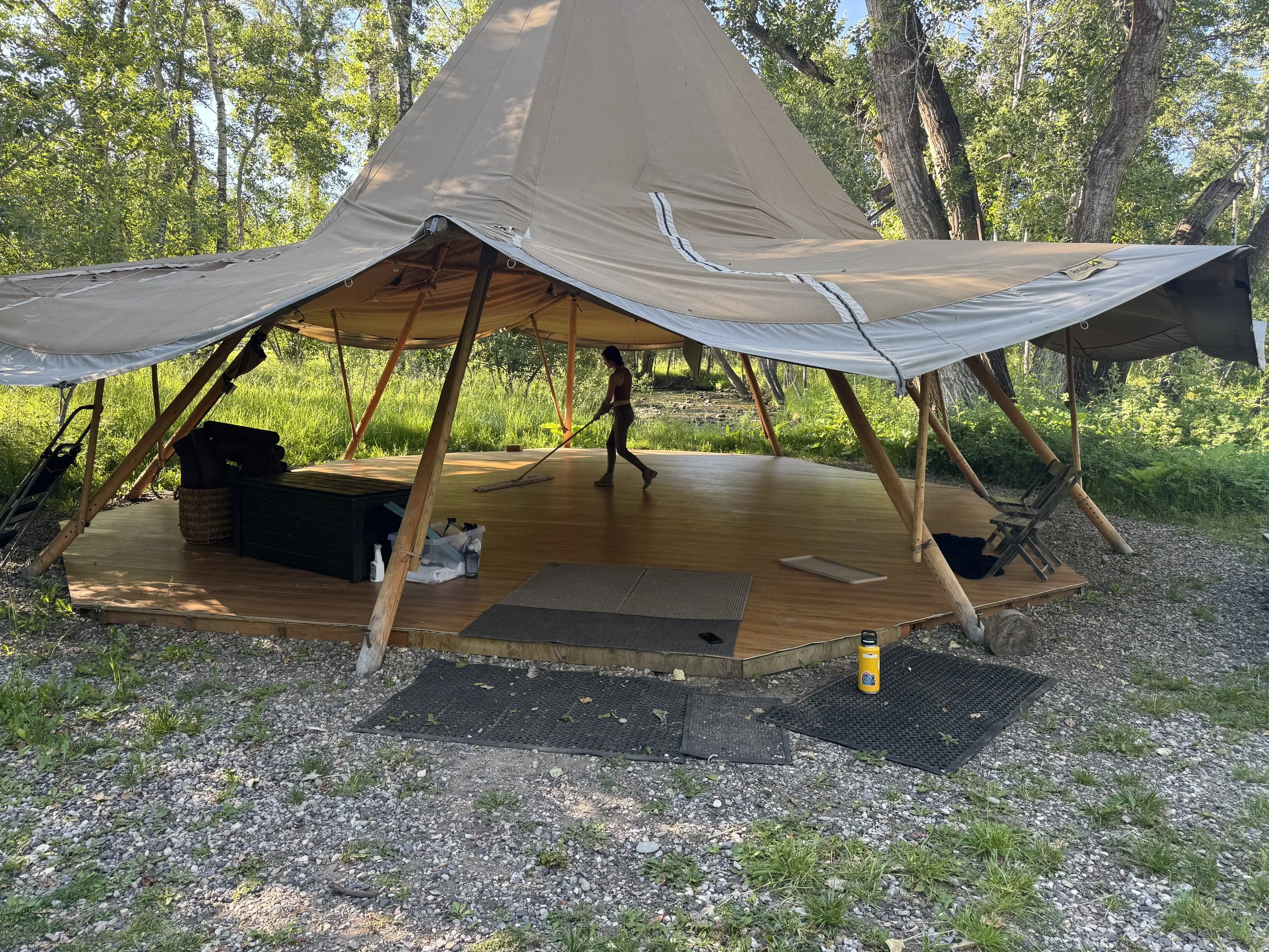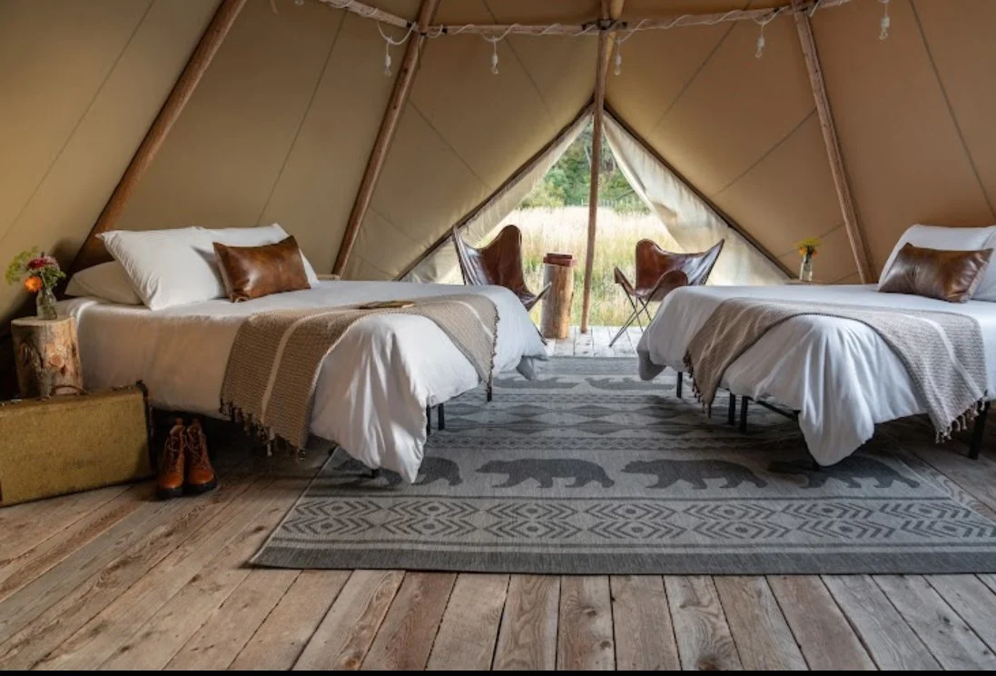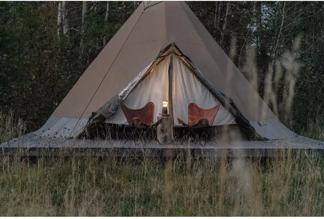 The 35 acre resort offers 9 glamping tipis scattered alongside Cottonwood creek, nestled amongst pines. It offers moments to breathe in a tranquil setting with creekside yoga, meditation garden, cold plunge creek after your customized yoga class. Our instructor Kat was perfect for our group of all levels. Incredible with water and bird songs around us. It was easy to be present in the moment. The resort offers personalized spa treatments and immersive outdoor experiences as well, because we are in Montana after all. The main thing that impressed us was their commitment to sustainability.